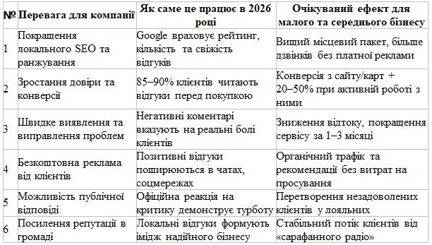 Таблиця ключових переваг відгуків для бізнесу в Бердичеві