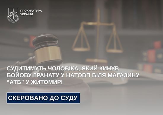 До суду скеровано справу стосовно чоловіка, який кинув бойову гранату у натовп біля магазину у Житомирі