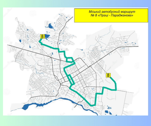 Окрім цього, з 10 листопада відновлюється робота автобусного маршруту №8 «Праці – Параджанова», який курсуватиме за наступною схемою: