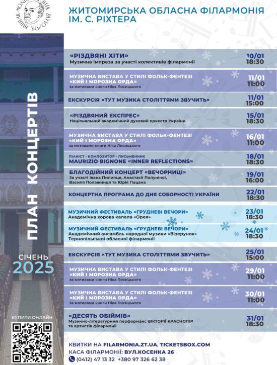 Житомирська обласна філармонія імені Святослава Ріхтера запрошує поціновувачів музики на концертні дійства, які відбудуться у січні.