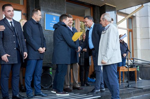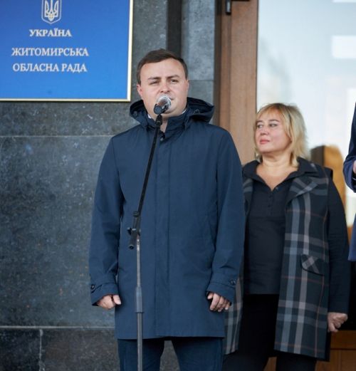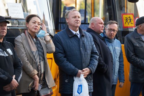 На майдані Корольова, перед будівлею Житомирської облдержадміністрації, відбулася урочиста передача громадам нових шкільних автобусів. Ключі та документи від транспортних засобів представникам громад вручав народний депутат України, голова Житомирської обласної партійної організації «Слуга Народу» Арсеній Пушкаренко разом із головою облдержадміністрації Віталієм Бунечком та головою облради від партії «Слуга Народу» Володимиром Федоренком.