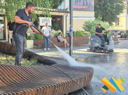 КП "УАШ" разом із компанією «Kärcher» влаштували професійне прибирання Михайлівської. Під прицілом водяних струменів — тротуарна плитка, лавки та місця загального користування біля кав’ярень.