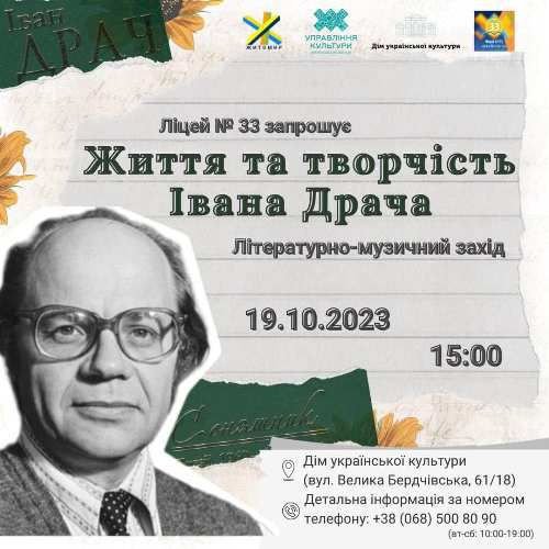 19 жовтня о 15:00 у Домі української культури відбудеться літературно-музичний захід, присвячений життю та творчості Івана Драча.