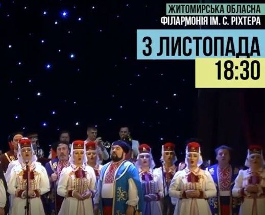 3 листопада о 18:30 на сцені Житомирської обласної філармонії ім. С. Ріхтера виступить відомий український Волинський хор з войовничою програмою «Вперед, соколи!».
