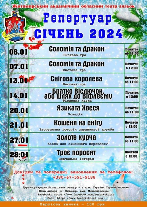 У січні 2024 рокі у Житомирському академічному обласному театрі ляльок відбудуться вистави для юних поціновувачів мистецтва.